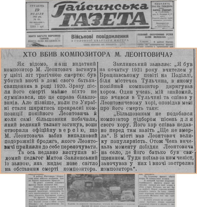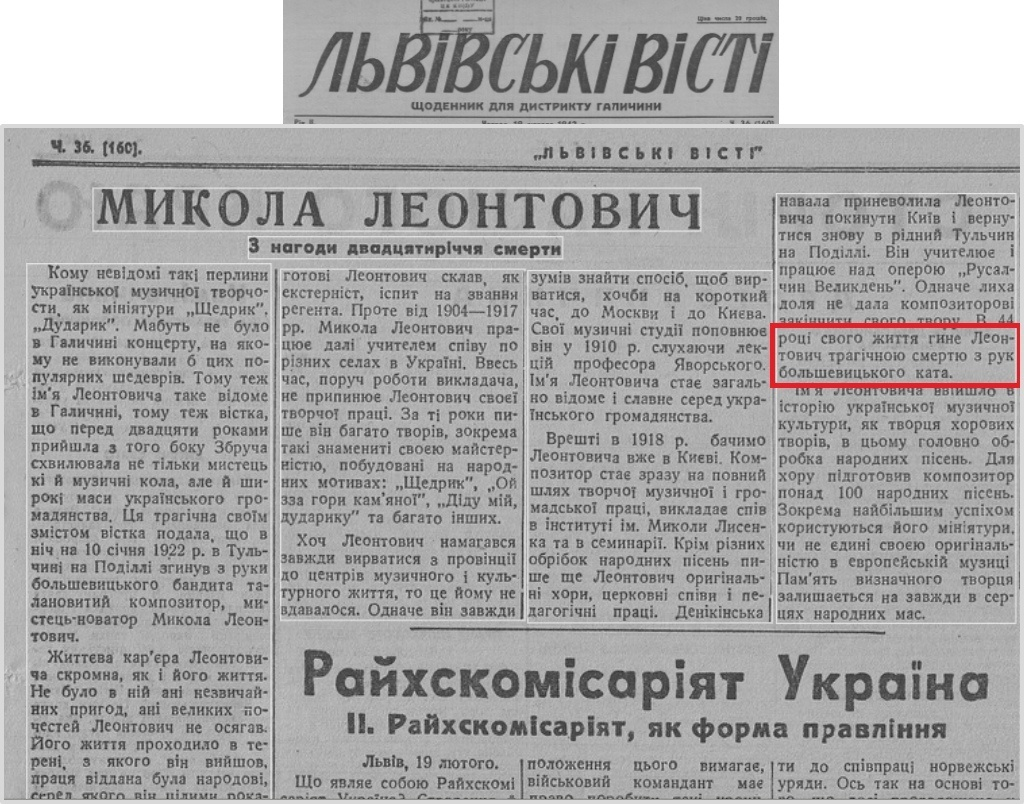 Свидомиты пишут, что советская пропаганда скрывала, кем был убийца Леонтовича и представляла его то петлюровцем, то деникинцем, то несистемным бандитом. Но независимая Украина в 90-х якобы нашла свидетельства, что это был чекист.