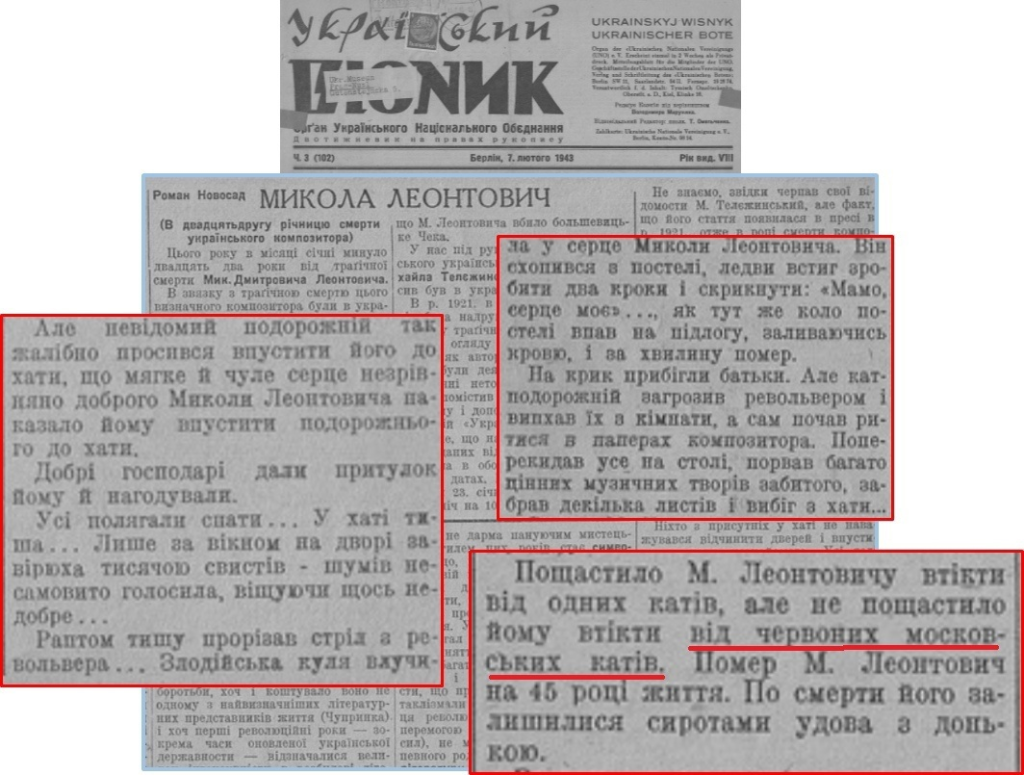 Вот и выходит, что обстоятельства смерти Леонтовича сфабрикованы, а их трактовка ложная. Строго по заветам методичек Геббельса его искусственно сделали «убитым советской властью». Вероятнее всего, убийство совершил обыкновенный для начала 20-х годов грабитель.