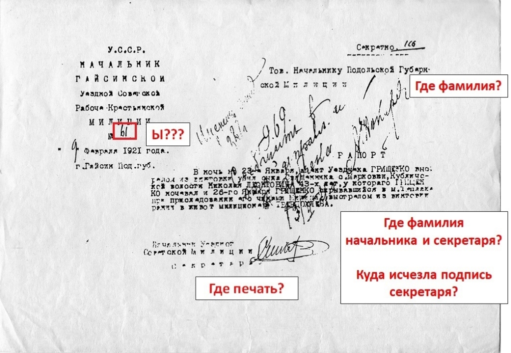А теперь обратите внимание на рапорт, в котором местная милиция информирует о смерти Леонтовича с номером «Ы». Он почему-то — в двух разных вариантах: рапорт на белом фоне размещен на страницах музея Леонтовича, рапорт на желтом фоне встречается почти в каждой публикации в украинском сегменте про его смерть. Они разные. Как такое может быть? Получается, рапорт — подделка?
