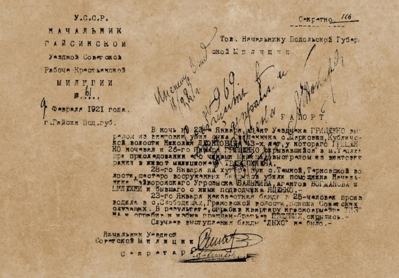 Предлагаю принять самый решительные меры к розыску и доставлению в следственную часть уездчека бывшего районного информатора уездчека Афанасия Грищенко, который, совершив преступления и убийство, неизвестно куда скрылся.