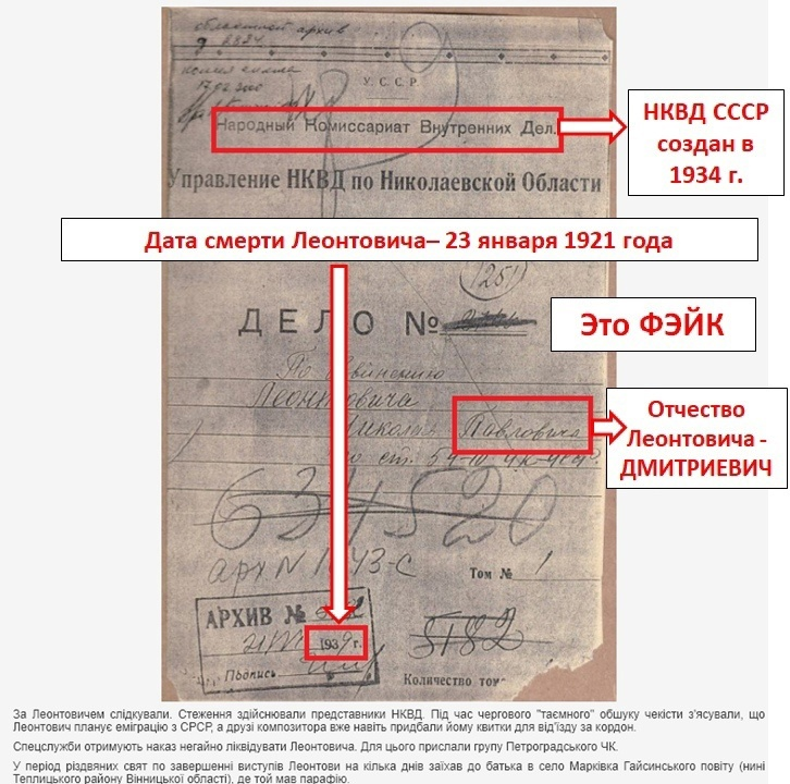 Посмотрите на обложку дела, которое якобы было заведено на Николая ДМИТРИЕВИЧА Леонтовича. Вы видите отчество? «Павлович»? Дело на убитого в 1921 году заведено НКВД? Но НКВД создано в 1934-м? Дело — фейк.В интернете гуляет цитата еще одного «документа», появившегося в публикации Кузика в 1996 году.