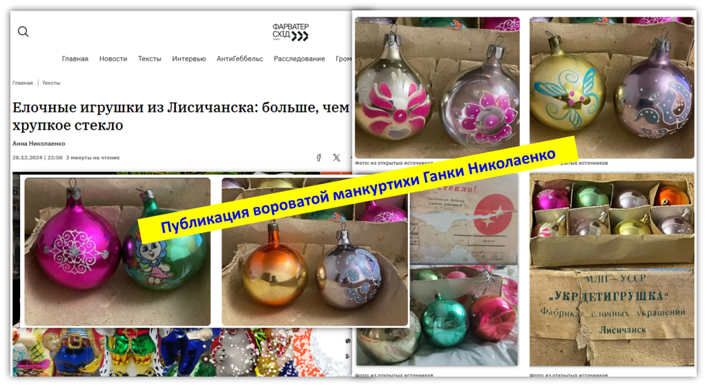 В предновогодние дни укро-Ганка слизала текст и своровала иллюстрации публикаций про дорогие для лисичан игрушки, выпускаемые когда-то в городе. Липкорукая манкуртиха прекрасно знает, откуда стырила чужие картинки, но соврала, сделав подпись без интернет-адреса: