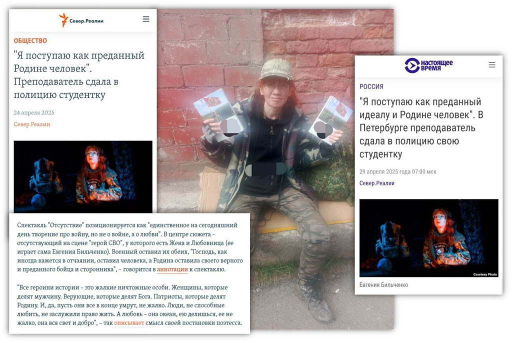 Спонсорша правосеков Е.Бильченко, мимикрировавшая под российскую патриотку, рекламирует свой «спектакль» в запрещённых в России, русофобских СМИ. Для этого использует грязную ситуацию, ею же спровоцированную, в которой она сама предлагала своей бывшей студентке выкрикивать экстремистский, проукраинский лозунг.