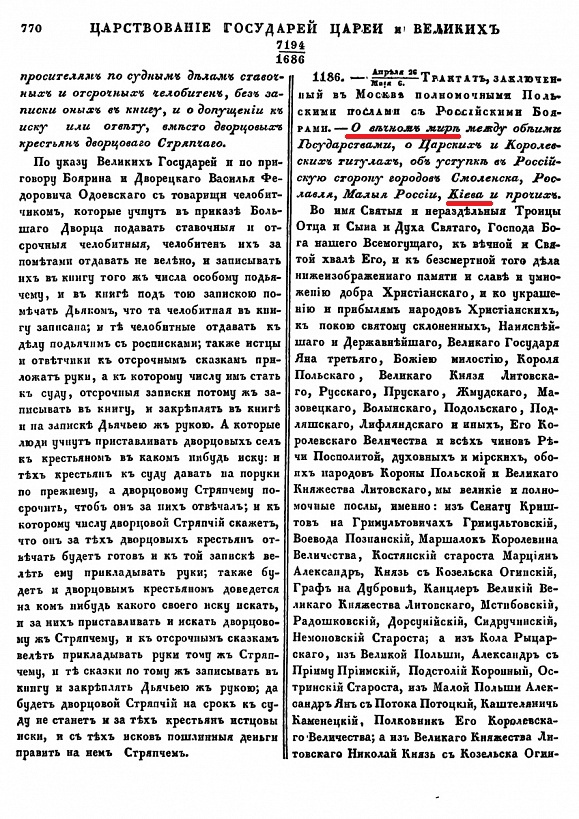 6 мая финальный документ был подписан. В нём признано владение Российским государством территорий, которые относятся к Левобережной Украине. В рамках договорённостей произошла передача “для вечного покою”, “по братской дружбе и любви”, а также за 146 тысяч рублей “вотчины извечной государя нашего”, “Богоспасаемого” города Киева.