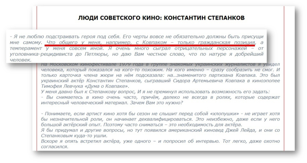 Бандеровцы, говоря о коммунистах, сыгранных Степанковым, ссылаются на то, что актёрская профессия – ветреная, как девица лёгкого поведения: какую роль предложили, такую и играют. И как будто роль Сидора Ковпака – “заказняк”. Но Степанков сам говорил, что его гражданская позиция совпадает совпадает с позицией советского партизана.