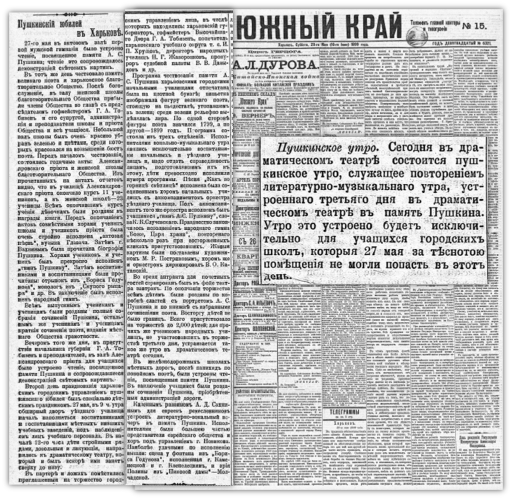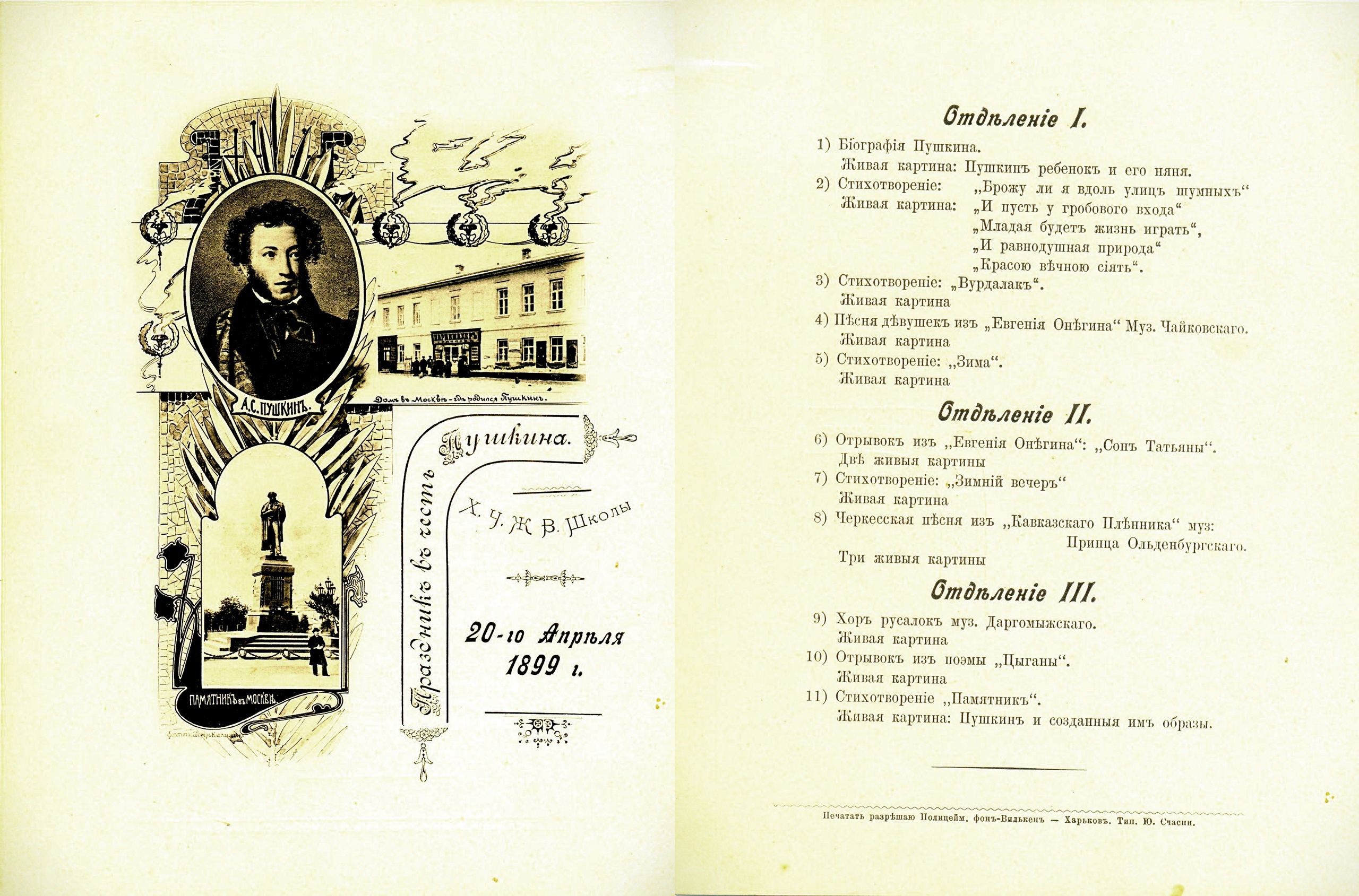 В 1899-м году 100-летнего юбилея со дня рождения в крупных и мелких городах будущей Украины проводились мероприятия, посвящённые великому русскому поэту. Причём организовывали их те, кого сейчас принято представлять светочем украинства. К примеру, 20 мая (по старому стилю) в частной воскресной школе Христины Алчевской в Харькове состоялся литературный вечер в несколько отделений с чтением стихотворений поэта и постановкой живых картин, иллюстрирующих сюжеты произведений Пушкина. 27 мая праздник прошёл в мужской гимназии, в Харьковском благотворительном обществе, приютах, в уездном училище, железнодорожном училище и др. Пелись гимны Пушкину, бесплатно раздавались книг. На отдельных мероприятиях присутствовало до 2 000 детей. Одна из центральных улиц города – Немецкая – была переименована в Пушкинскую.