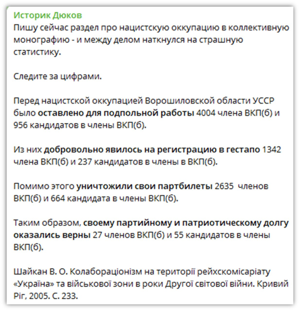 Честно говоря, много ещё что можно сказать историку, насчитавшему вслед за свидомой историкиней лишь 27 честных коммуниста в Ворошилоградской области во время войны. Но скажу лишь одно: принимая за правду ложь врага России, можно и самому стать врагом России.