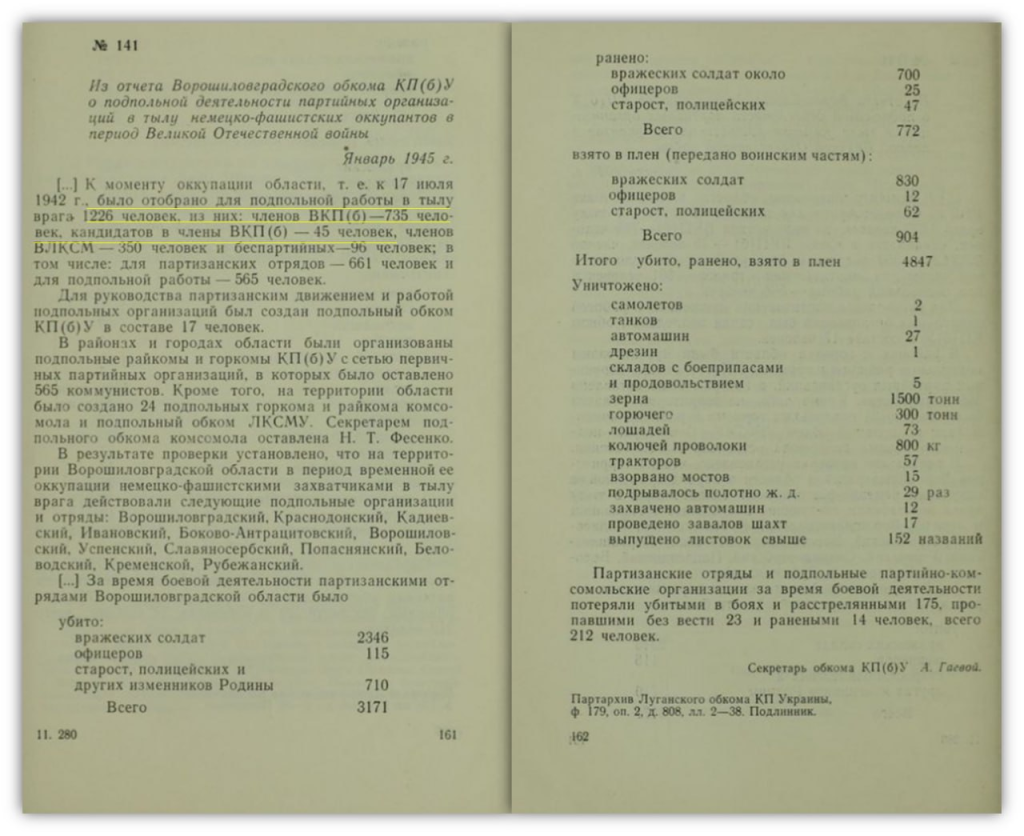 Указанное число оставленных в подполье коммунистов. Оно сильно разнится с документами, имеющимися в открытом доступе. Так в отчете Ворошиловградского обкома КП(б)У (Партархив Луганского обкома КП Украины, ф. 179, оп. 2, д. 808) сказано про 735 членов ВКП(б) и 45 кандидатов в члены ВКП(б) (а не 4004 и 956 соответственно). В результате число добровольно явившихся и уничтоживших свои партбилеты становится невероятным до уровня бреда одержимых.