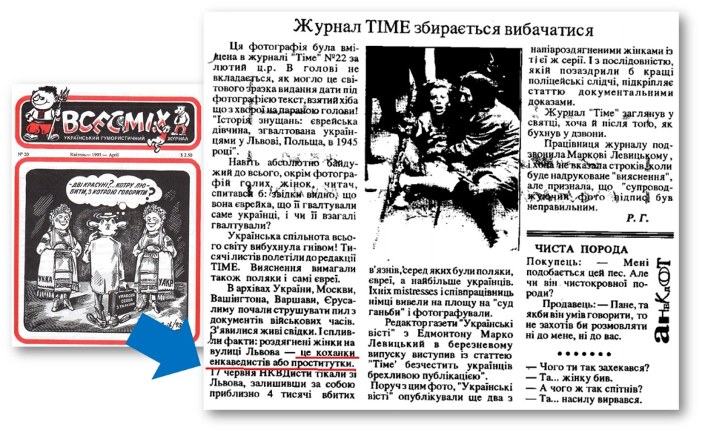 Украинский журнал “Всесміх” за январь 1993 года. В нём – одна из самых известных фотографий львовского погрома, практически его символ. На снимке – молодая женщина, взывающая к садистам. Во всем мире именно эту фотографию используют в качестве иллюстрации страшных дней конца июня-начала июля во Львове, когда укро-националистические живодеры по-своему решали национальный вопрос и расправлялись с евреями. Есть еще один ракурс с этой же женщиной – в разорванной одежде, почти голой.