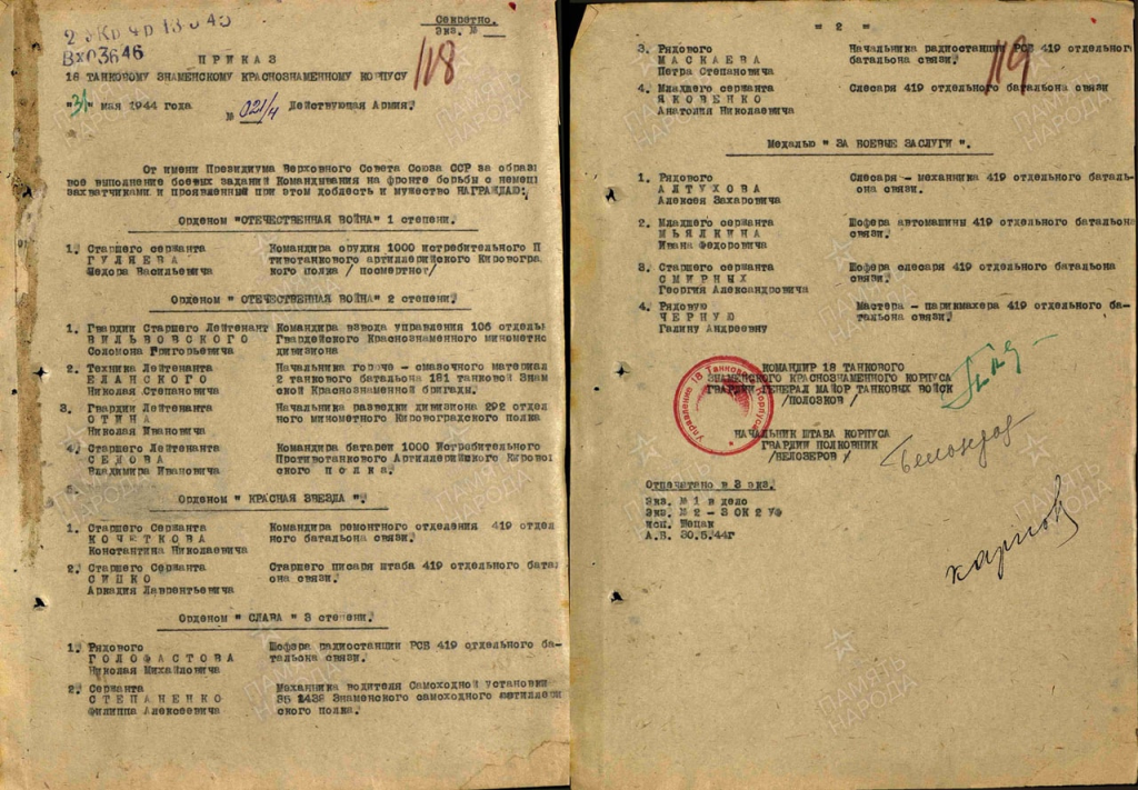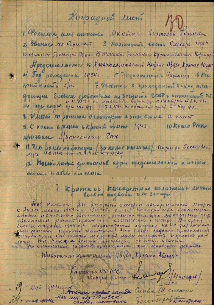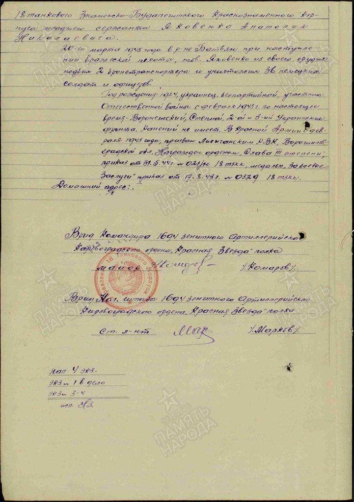 Из наградного листа Яковенко Анатолий Николаевич, 1924 г.р., уроженца Лисичанска, украинца, беспартийного, представленного к награде Орденом III степени: