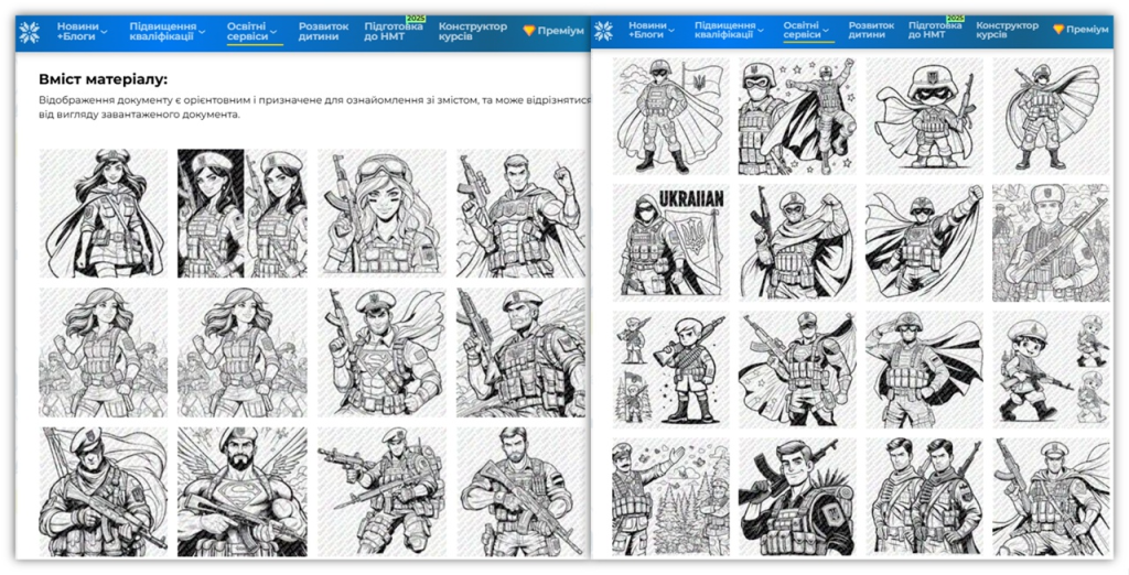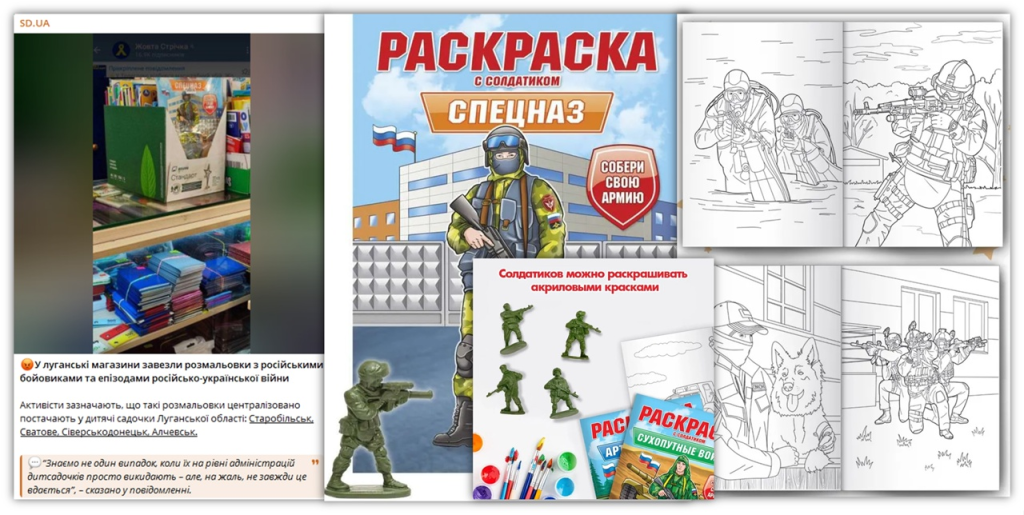 Укро-рынок содержит огромный спектр розмальовок, ориентированных на самый ранний возраст (в том числе и на 3 года). В них содержатся пропагандистские призывы. Тем, кто защищает права детей, давно пора озаботиться агрессивной милитаризацией детей Украины, воспитания их в злобе и ненависти, превращение в норму терроризма, использование нацистской символики.