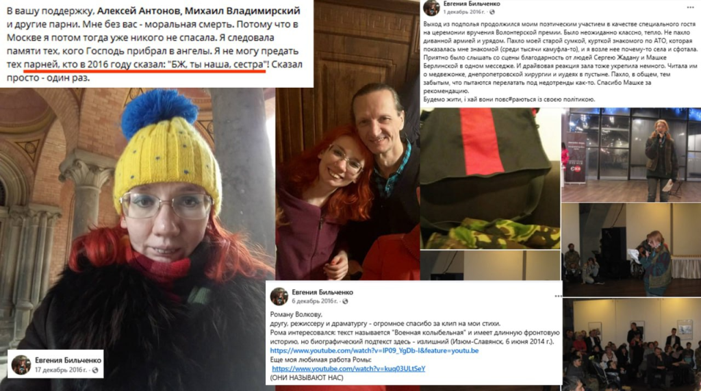 А теперь перейдём в её тщательно (но не до конца) вычищенные соцсети, в самый конец заявленного 2016-го года. Весь декабрь Е.Бильченко гарцует в шапчонке с жовто-блакитной расцветкой. Рядом – бледная тень биологического объекта “Аркадий Веселов”, который теперь зуб даёт, что его партнёрша тогда была за Россию. На цветовые предпочтения можно сказать, что это – нечаянно.