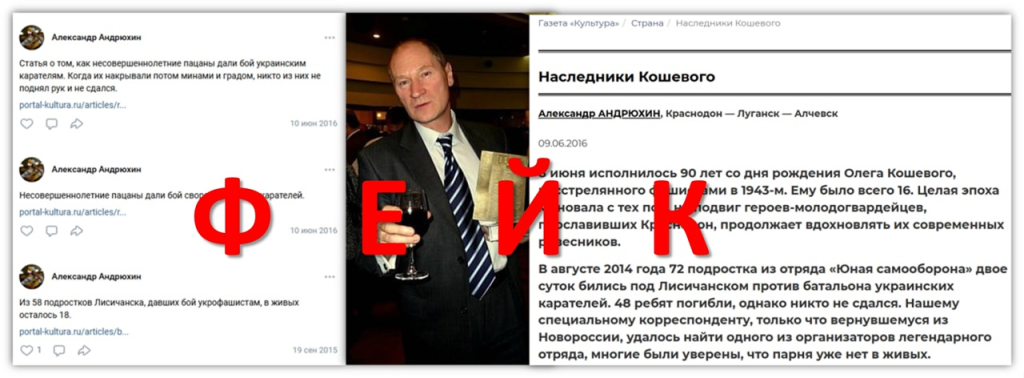 9 июня 2016 года в газете “Культура” опубликована статья Александра Андрюхина с обязывающим названием “Наследники Кошевого”. Позднее, в 2023 году, Малькевич полностью воспроизвёл эту подачу фейка: погружение реципиента информации (читателя/слушателя/зрителя) в воспоминание о героизме “Молодой Гвардии” для того, чтобы звенели эмоции, с последующем переходом к “герою наших дней”, сочинителю “Юной самообороны”.