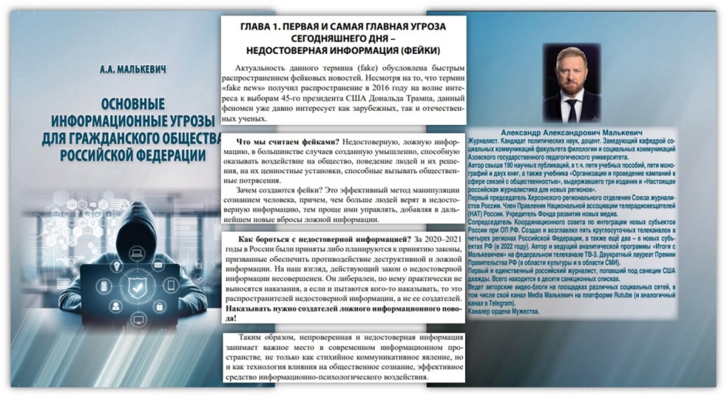 В 2024 году Малькевич издал 164-страничную книжку “Основные информационные угрозы для гражданского общества Российской Федерации”, которую скромно именует “научное издание”. Однако указать, какое именно научное издание, обладатель ученой степени и звания почему-то не смог. Книжка – не статья, не патент, не диссертация, не научный отчёт и не монография. Однако 3 доктора наук написали рецензии и не указали автору на эту странность, как и на то, что научная публикация представляет собой тщательный анализ темы, а не текст в стиле “обо всём – по верхам”.