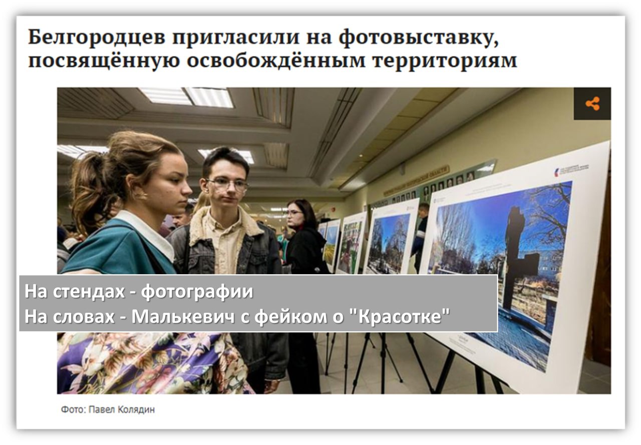 В октябре 2023 года пресса Белгорода сообщила о мероприятии – фотовыставке “Освобождённые территории. Война и мир глазами очевидца”, одобренной грантом Президентского Фонда Культурных Инициатив. Автором снимков был кавалер ордена Мужества, известный журналист Александр Малькевич (https://t.me/alexandr_malkevich).
