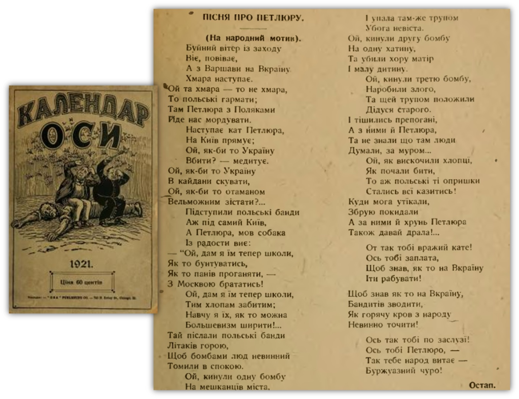 Свидомые, “герой”, говорите. Народного творчества вам про ката Петлюру – бандита и продажного хруня. По мотивам шевченковского “Віє вітер повіває..”. Источник – “Оси”, 1921.