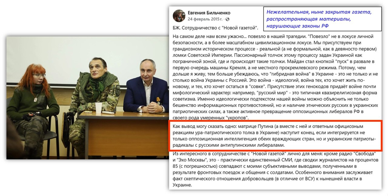В 2015 году Е.Бильченко в интервью ныне закрытой газеты (являющейся нежелательной, замаранной дискредитацией Вооружённых сил России и связанной с иноагентом) чётко и понятно сформулировала концепцию своей деятельности, которой она следует и сейчас, не отклоняясь в сторону: