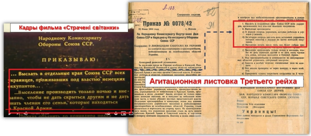 И начнем с конца фильма, чтобы понять имеют ли право авторы в начале цитировать Библию. А там – фальшивка, нарисованная на коленке не самыми талантливыми фейкомётчиками Министерства пропаганды Геббельса, а именно – приказ, которого никогда не было, № 0078/42 “О ликвидации саботажа на Украине”. Существовал он только в виде агитационной листовки Третьего Рейха и вбрасывался с целью дискредитации СССР.