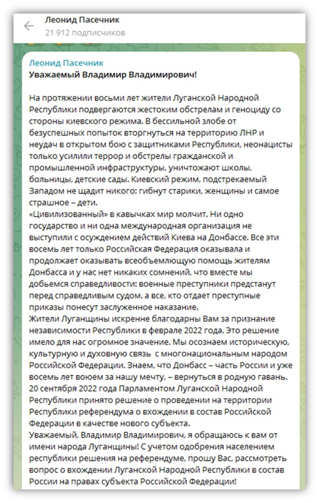 Уважаемый, Владимир Владимирович, я обращаюсь к вам от имени народа Луганщины! С учетом одобрения населением республики решения на референдуме, прошу Вас, рассмотреть вопрос о вхождении Луганской Народной Республики в состав России на правах субъекта Российской Федерации!