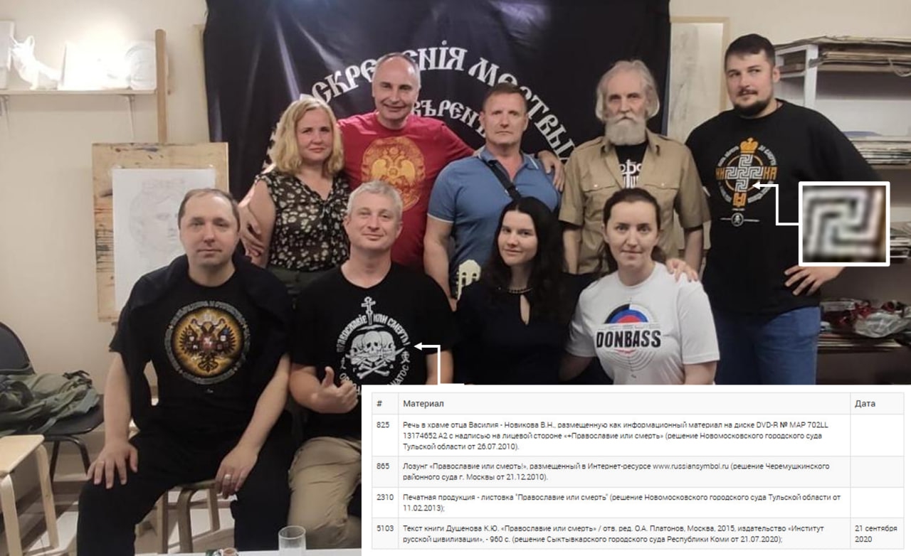 Однако вместо того, чтобы вклиниваться в законотворчество, всей этой компании триединцев следует внимательно изучить те нормативы, по которым живёт Россия. Моисеев называет футболки Мирошниченко одеждой его организации “Триединая Русь”. Однако художник, который не сдерживает свои весьма опасные порывы, выписывает на них экстремистские лозунги, слизанные с бандероского призыва Украина або смерть!” – “Православие или смерть” (“Ὀρθοδοξία ἢ θάνατος”). Этот лозунг включён в Федеральный список экстремистских материалов.