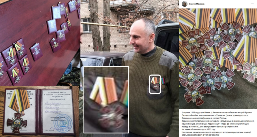На многих фотографиях харьковский деятель красуется в медалях. В частности, на снимке с Александром Бастрыкиным, которой Моисеев похвастался 3 октября, на его пиджаке можно заметить наградной знак, очень похожий на весомую ведомственную медаль Министерства Обороны “За боевые отличия”. Согласно Положению ею награждаются военнослужащие Вооруженных Сил РФ: