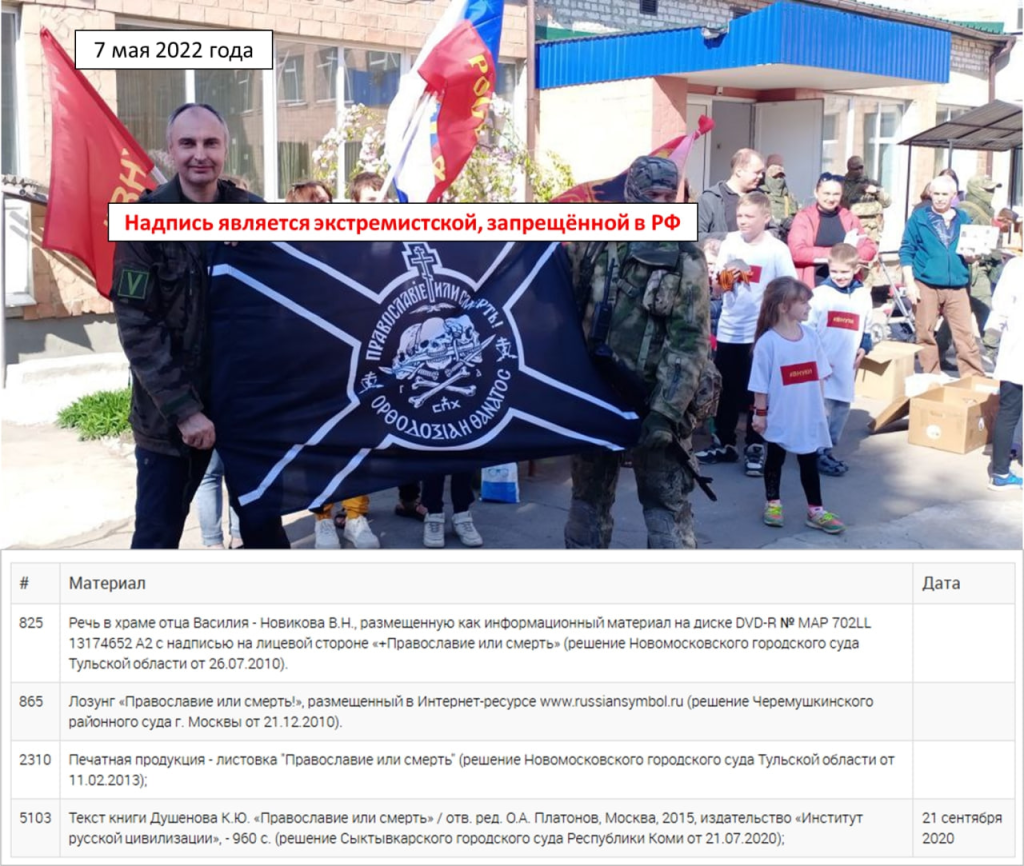 Однако никаких признаков военной службы у харьковского общественника обнаружить не удалось. В первые дни СВО он активно фотографировал себя и других триединцев в форме и даже кое-где с оружием, которое, судя по всему, ему дали просто подержать. При этом весной 2022 года он то дома, за тысячи километров от линии фронта, то на каких-то гражданских сборищах, то на улицах Сватово с флагом, “украшенным” экстремистской, запрещённой в РФ надписью “Православие или смерть”. Одновременно харьковский общественник срочносборил вместе с Анастасией Моисеевой, ездил туда-сюда с гуманитаркой.