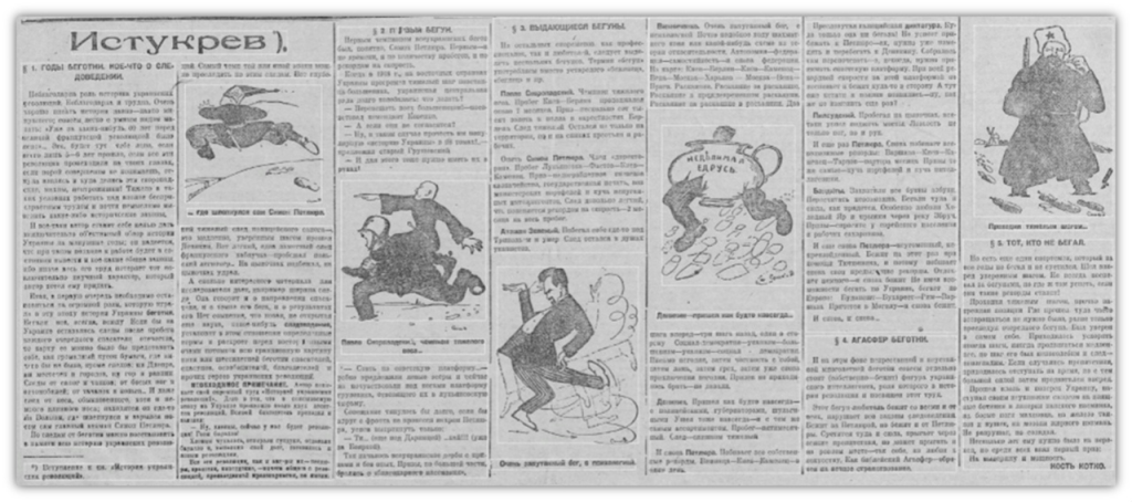 Агасфер беготни. И па этом фоне непрестанной и неустанной многолетней беготни совсем отдельно стоит (собственно — бежит) фигура украинского интеллигента, роли которого в истории революции и посвящен этот труд. Этот бегун-любитель бежит со всеми и от всех, нарушает все законы следоведения. Бежит за Петлюрой, но бежит и от Петлюры. Суетится туда и сюда, прыгает через всякие препятствия, но может прыгать и на ровном месте — так себе, из любви к искусству. Как библейский Агасфер — обречен па вечное странствование