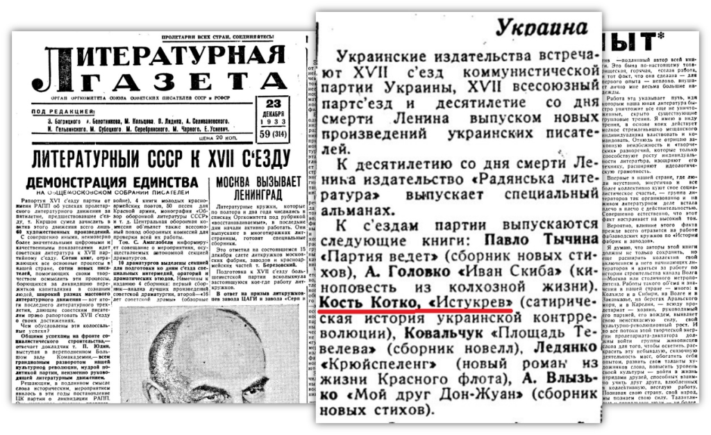 В 1924 году в газете “Коммунист” № 285 от 12 декабря опубликованы фрагменты “Истукрева” – сатирической истории украинской революции Костя Котко (настоящее имя – Николай Левченко). Карикатуристом, проиллюстрировавшим эту публикацию, был Александр Довженко. Его подпись – “Сашко”.