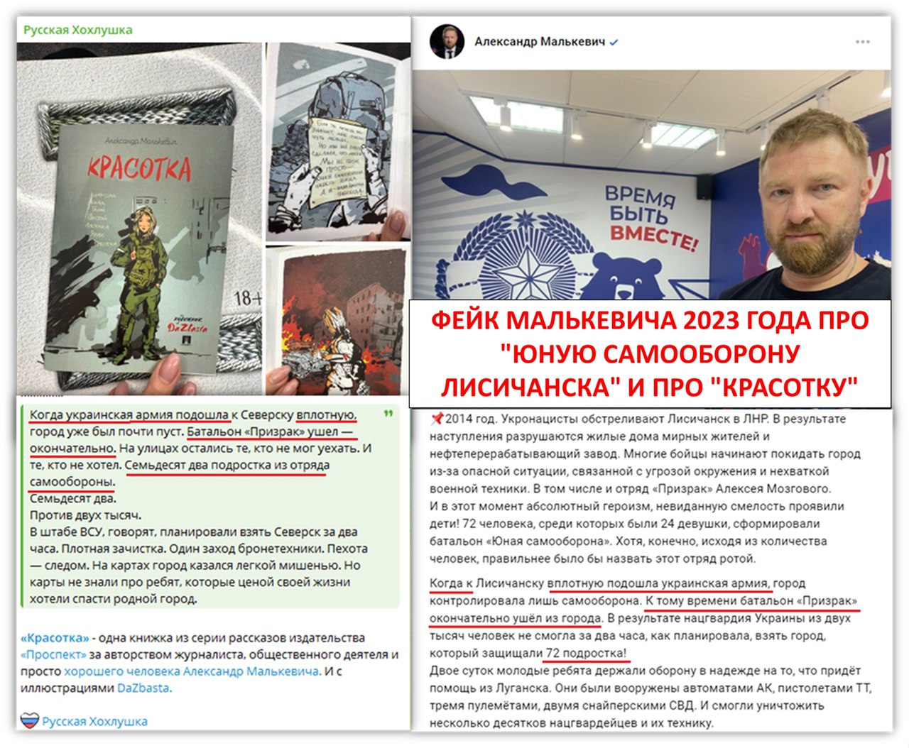 Где-то этот текст мы уже видели – в посте Малькевича, датированном 23 сентября 2023 года, в котором он представляет фейк про “Юную самооборону Лисичанска”. Именно на этот пост фейкомёт получал призыв от ополченцев проверить достоверность того, что он несёт в массы). Но тот героизм других людей приписывал несуществовавшим бойцам-подросткам: