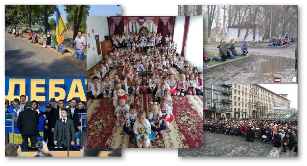 Но все-таки «гіднiсть» как-то связана с достоинством. Отбросим один из анатомических смыслов этого русского слова, который сразу же приходит на ум. Пусть будет достоинство в своём основном значении, включающем уважение к самому себе. Но тогда получается, что Украина, отрезав себя от единой страны и потеряв связь с Россией, прошла кастрацию и потеряла своё достоинство. Массовая коленопреклоненная поза стала прочно ассоциироваться со свидомой Украиной. На колени становятся все — полицейские, учителя, пожилые люди, маленькие дети и даже президенты.
