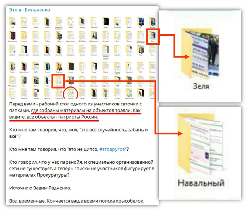 Сейчас у неё — стадия нездорового и необоснованного торжества. Она выкатила какой-то скан с несколькими папками, некоторые названия у которых таковы: «Минобороны», «Колготки», «Зеля», «РИА», «РИ», «Моё», «Навальный», «ВВП», «Каменты о детях», «Коты», «Всратые цитаты». Перечисленное Е.Бильченко назвала объектами травли и патриотами России.