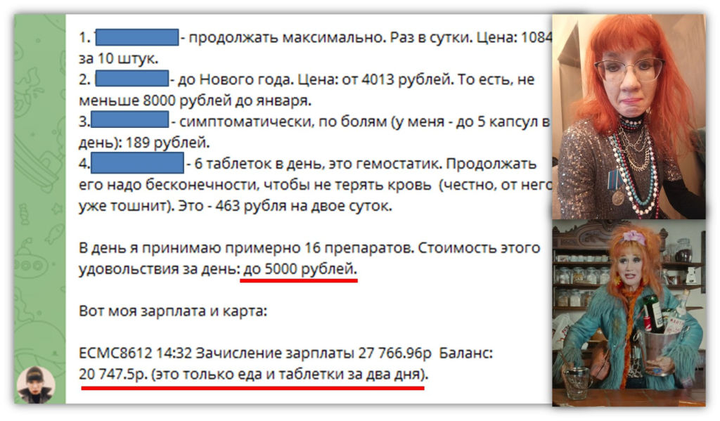 Е.Бильченко не была бы Е.Бильченко, если бы для попрошайничества не использовала украинский вариант математики. Она выкатила раскладку по расходам, перечислив 4 принимаемых фармакологических препарата (причём один из них назначается курсом 10-20 дней, а не постоянно). Не проверяя цены, поверив в дозировки, просуммируем и получим, что в сутки ей нужно примерно 663 руб. (в месяц — 19 890 руб.).