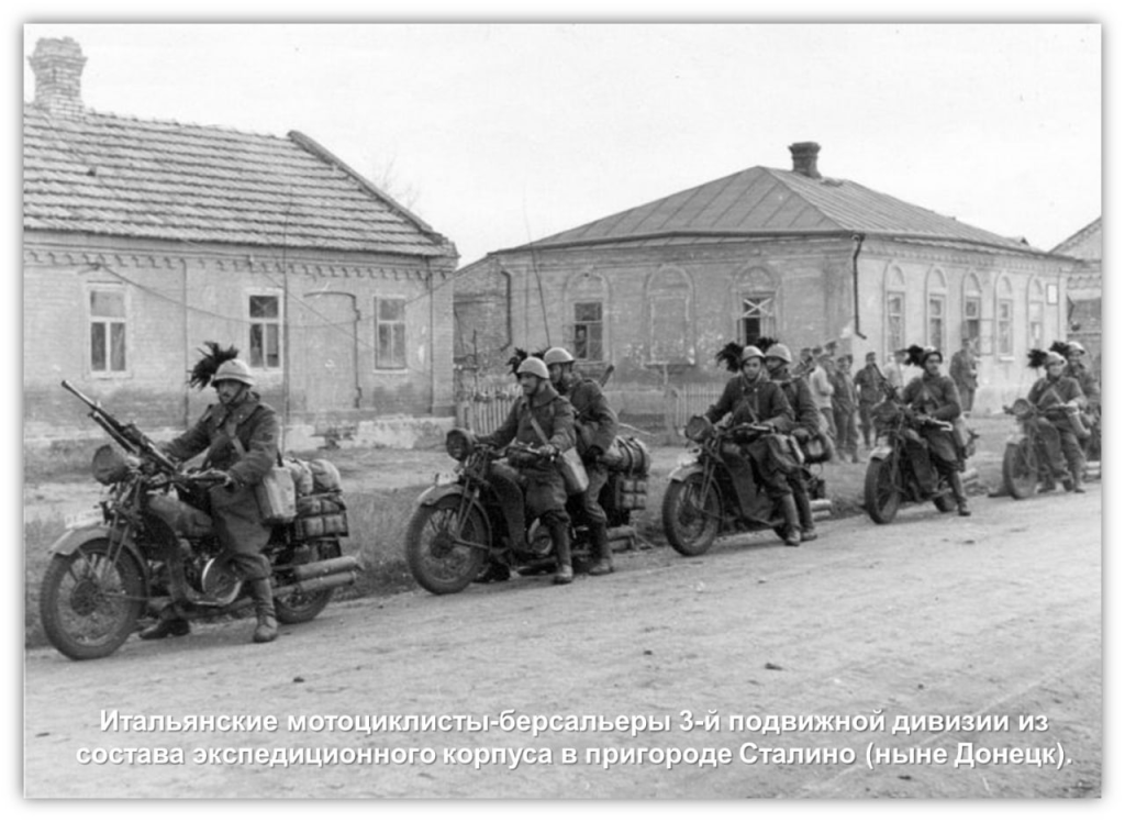 На фото — пригород Сталино (Донецк) и фашисты-итальянцы. В 1943 году вышла книга «С итальянской армией в России». Автор был указан так — Марио Тарчи. На самом деле им был Джусто Толлой, майор Генерального штаба Итальянского экспедиционного корпуса в России (CSIR).