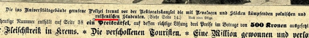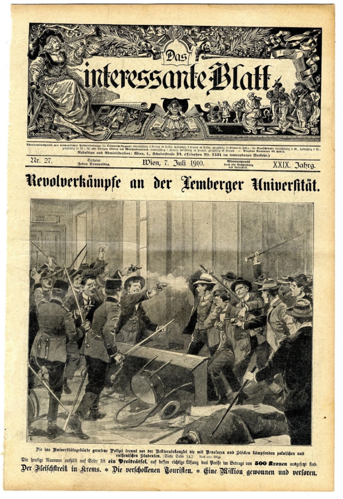 Первая иллюстрация — это скан с титула австрийского журнала «Das interessante Blatt» от 7 июля 1910 года. Украинские историки радостно таскают его, сопровождая рассказом о том, как студенты-украинцы Львовского университета отстаивали своё «национальное достоинство» в стычках с поляками.