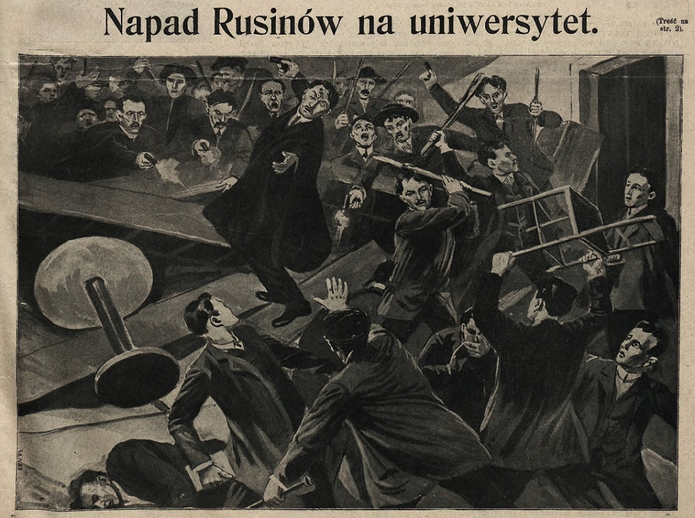 Что же тогда произошло? Этнический состав Львова в начале ХХ века был таким, что русины не составляли приоритетную этническую группу по сравнению с поляками и евреями. Но они не желали учиться на польском, считали себя притеснёнными. 1 июля 1910 года на уличных баррикадах Львова начались студенческие столкновения с поляками на почве межнационального конфликта. Они переместились в стены университета. Всего бунтовали примерно 300 человек. Кроме палок, в ход пошло огнестрельное оружие. Пострадало 27 человек. Один был убит выстрелом в голову.