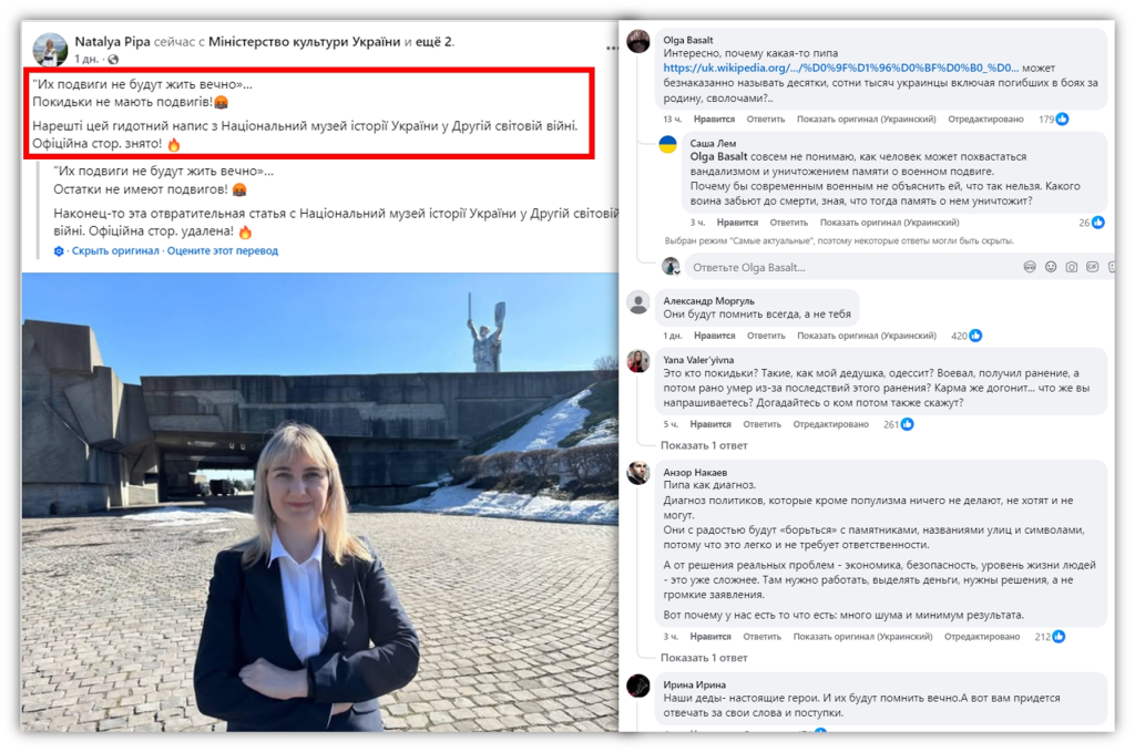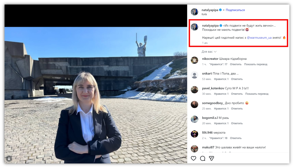Но сейчас моральная уродица пошла дальше. Она среагировала на демонтаж на национальном музее истории Украины надписи «Их подвиги будут жить вечно» грязными словами: