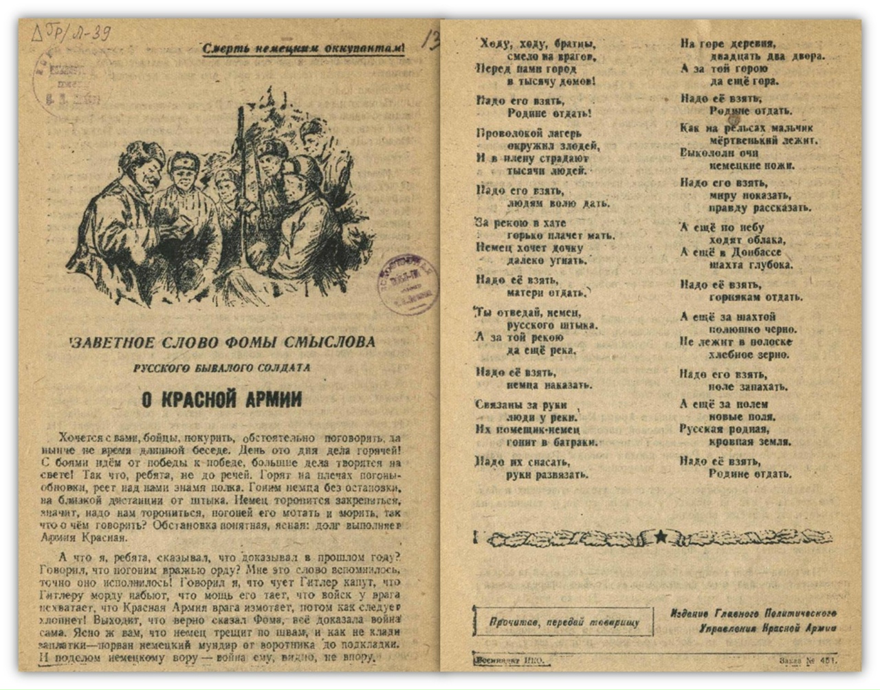 Острое слово всегда было оружием русской армии. Во время Великой Отечественной Войны на фронте популярны были лубочные рифмованные истории, рассказанные от имени некого солдата: