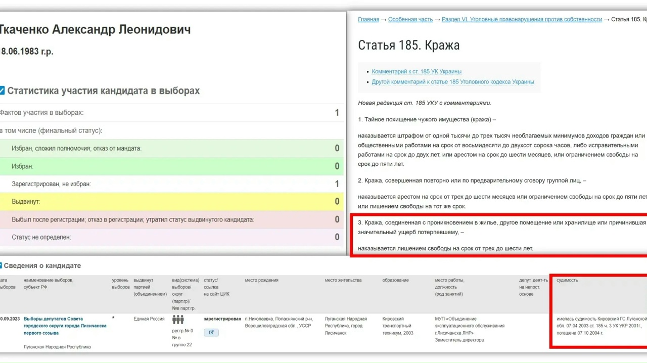 Но пахан не успокоился. И 21 октября 2025 года к уже внедрённым во власть экс-уголовникам добавился ещё один — Ткаченко Александр Леонидович, 1984 г.р., с судебным приговором по ст. 185 ч. 3 УК Украины 2001г. («кража, соединенная с проникновением в жилье, другое помещение или хранилище или причинившая значительный ущерб потерпевшему»). Как легко догадаться, этот депутат — представитель «Единой России» .