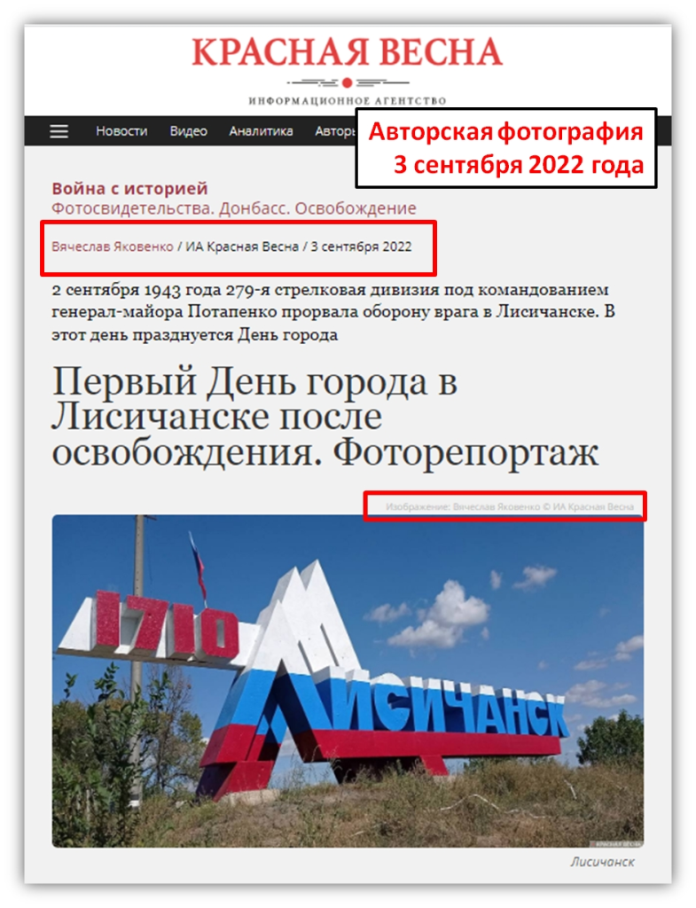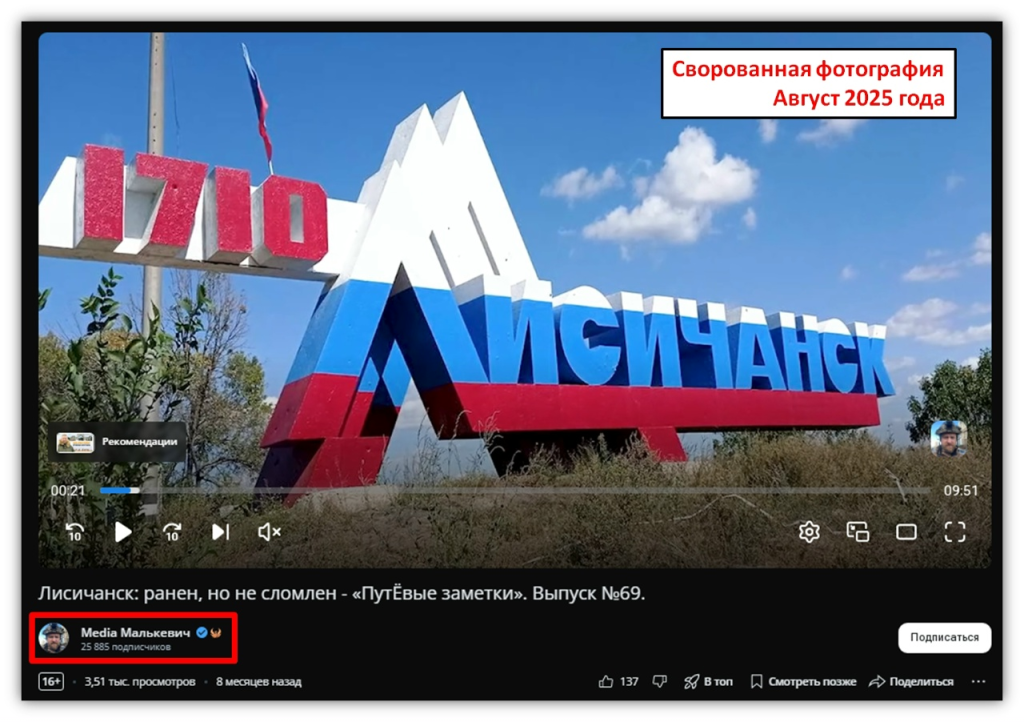 Но на сей раз мы поднимаем не этот вопрос. Начало фильма, выпущенного Малькевичем в 2025 году, украшает яркая фотография стелы, расположенной на въезде в Лисичанск, окрашенной в цвета российского триколора. Но снимок этот Малькевичу не принадлежит, у него есть автор. И мы его назовём.